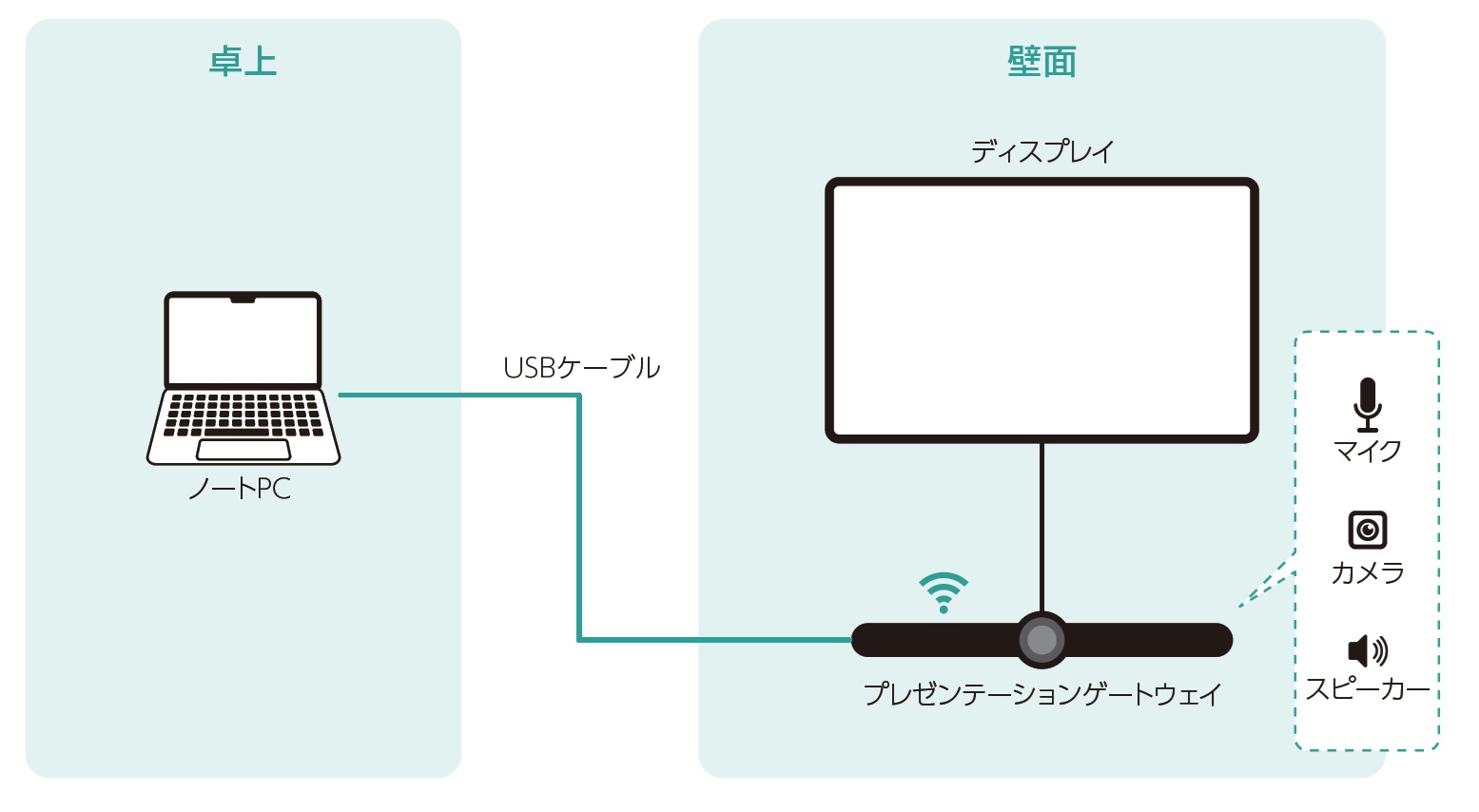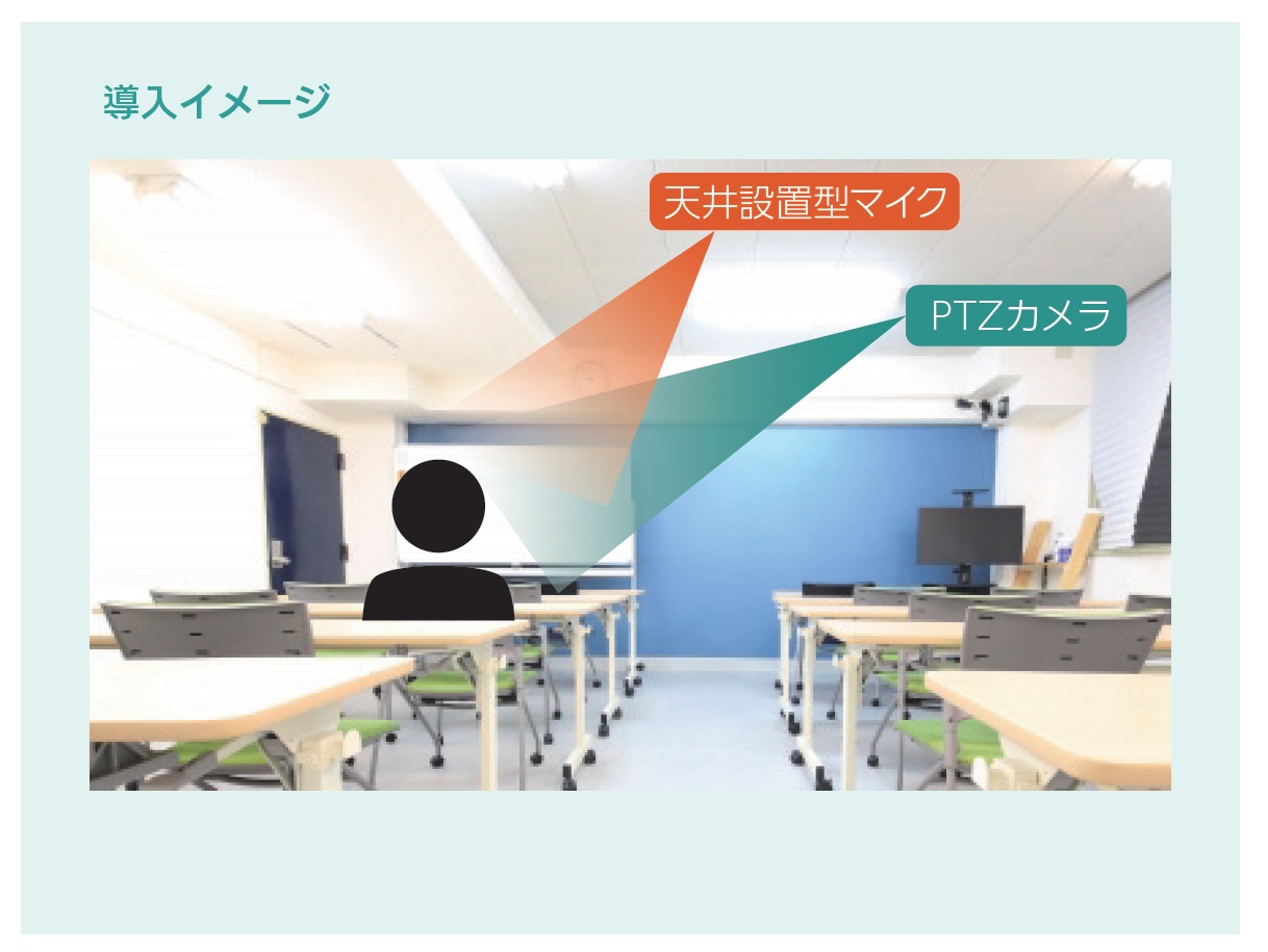 天井設置型や卓上型の会議マイクをON にすることで、PTZ(パン・チルト・ズーム)が可能なカメラが自動的に発言者にフォーカスし、Web 会議等の接続先に発言者をアップで映します。参加者の多い会議でも発言者をフォーカスすることで「誰が話しているのかがわからない」といった問題を解決し、円滑なコミュニケーションを可能にします。